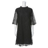 レース刺しゅうをデザインした七分袖ワンピースです。刺しゅうの繊細さとゴージャス感を味わえ、すっきりとしたラインも感じられる、年間を通して楽しめるデザインです。
