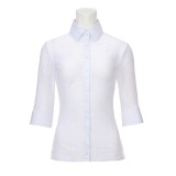 繊細なレースを使用し、エレガントさの引き立つ七分袖シャツです。身頃は、当ブランドでイタリアンジャージーと呼んでいるストレッチ性のある着心地の良い素材を使用しています。