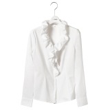 襟元に二重のフリルをあしらった長袖ブラウスです。ハリ感のある生地を使用し、一枚で着てもきちんとした印象に見せてくれます。