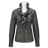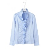 襟から前立てにかけて二重フリルをほどこした、フェミニンで上品な長袖ブラウスです。ギャザーを寄せてふっくらとさせた肩部分と胸元のギャザーで、立体感のあるフォルムに仕上げました。