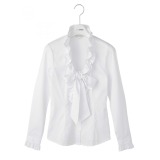 U字に開いたネックラインがデコルテをきれいに見せてくれる、長袖のフリルリボンブラウスです。カフス部分にもフリルをほどこし、エレガントな表情に仕上げました。