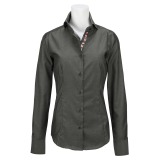 クレリックタイプの長袖シャツです(ホワイトの襟、袖口部分は身頃と同色)。ほどよい光沢感のあるコットンツイル生地を使用し、一枚でもきちんとした印象に見えます。