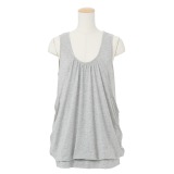 ラメのように輝くナイロン糸入りの杢調素材を使用したベストです。身頃は二枚仕立てになっていて、ギャザーと脇のシャーリングでボリューム感のあるデザインに仕上げました。