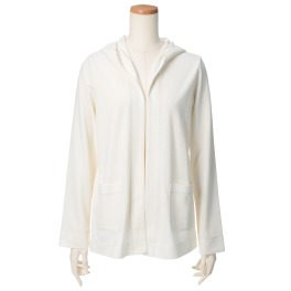 ■身頃:MVS糸を用いた、とろみのある微光沢のポンチ素材を使用。トッパーカーディガンに、フードをあしらったシンプルなデザインです。