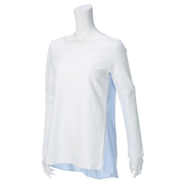 前身頃と袖に綿混のカットソー生地を使用し、後ろ身頃を綿100%のストライプ柄の生地で切り替えた、かわいらしい印象のアイテム。