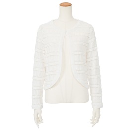 繊細なレースで華やかに仕上げたボレロ丈のジャケットです。細いフリルをボーダー柄にあしらい、立体感を演出。