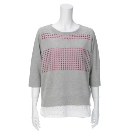 ■身頃:身頃上部のニット部分は非常に細い綿混の糸を使用した、ガーゼタッチの柔らかい肌触り。身頃下部の布帛部分はドット風の立体的な柄が個性的な仕上がりで、デザインのポイントになっています。