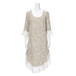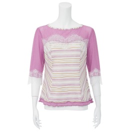 ■身頃:ベースにやさしい風合いのレーヨン混ストレッチ素材のカットソーを使用し、前身頃に華やかなフラワーモティーフの刺しゅうレースを重ねています。
