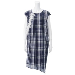 表地に瑞々しい光沢感とほどよい透け感のある、上品なチェック柄の素材を使用したワンピースです。前身頃襟ぐりから後ろ身頃脇部分にかけてあしらわれた、幾重にも繋げた丸形状のフリルがデザインのポイント。