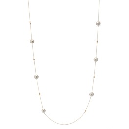 ほんのりゴールドがかったコットンパールと、ミラーボールを交互にバランス良く配したステーションデザインのロングネックレスです。