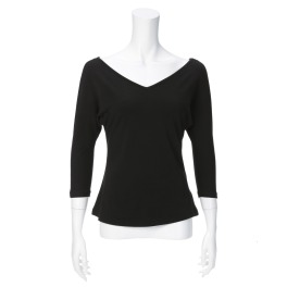 ■身頃:レーヨンと綿、シルクなどをミックスした、細くて柔からかな混紡糸のベア天竺を使用。襟は、前後ともゆったりとしたVネックに仕上げました。