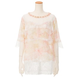 ■身頃:当ブランドで人気の、立体的なローズモティーフをほどこしたデザイン。ぷっくりとした立体感がかわいらしいローズモティーフを表現するために、天竺の編地の表側と裏側で編目の数を変え、糸の調子を整えな…