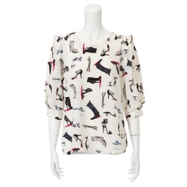シューズプリントがデザインされたブラウスです。肩から流れるようにあしらったフリルが腕をすっきりと見せてくれます。