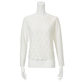 前身頃のレースがフェミニンなクルーネックの長袖ニットプルオーバーです。身生地はシャリ感のある素材で、インナーを合わせた時に滑りが良く、着やすい一枚。