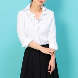 上品で光沢感のあるコットンツイル生地で丁寧に仕立てた七分袖ブラウスです。ボリューム感のあるフリルをフロントにあしらい、お顔周りを華やかな印象に見せてくれます。ウエスト部分をシェイプさせた細身のシルエットもポイント。【詳細】・裾スリット:なし・肩パット:なし・ポケット:なし【素材】・綿98%、指定外繊維(ポリオレフィン系弾性繊維)2%【メンテナンス(絵表示ラベル)】・手洗い:可・塩素系漂白:不可・ドライクリーニング:石油系のみ可・アイロン:中温、あて布・乾燥:タンブラー乾燥不可・干し方:日陰で吊…