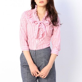 ギンガムチェック柄の素材を使用した愛らしい印象の七分袖ブラウスです。フリルをたっぷりとあしらったデザインで、表情を華やかに演出します。