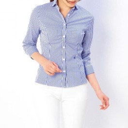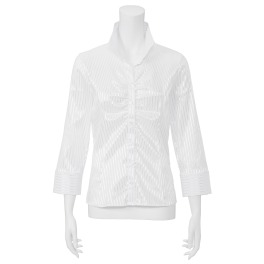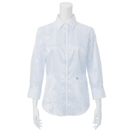 光沢のあるストライプ柄が知的でシャープな印象の七分袖シャツです。襟や袖などを白の無地生地で切り替えたクレリックタイプ。