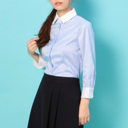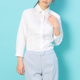 小ぶりの襟にレースをほどこした、清楚な女性らしさを感じさせる七分袖シャツです。上品な光沢感のあるコットンベースの生地を使用。