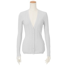 アイレットリブデザインのVネックの長袖カーディガンです。ほのかに煌めくラメ入りの素材で、リュクスな雰囲気を演出してくれる一枚。