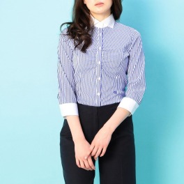 光沢のあるストライプ柄が知的でシャープな印象の七分袖シャツです。襟や袖などを白の無地生地で切り替えたクレリックタイプ。