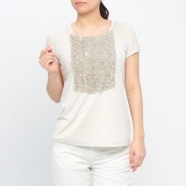アームホール部分にほどこされた繊細なビジュウがきれいな印象のプルオーバーです。さらっとした肌触りの良い、しっかりとしたグログラン素材を使用。