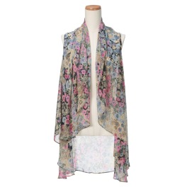 シルクのように軽くて肌触りの良いシフォン素材を使用した、おしゃれなペイズリー柄のジレです。やさしいカラーの線タッチで描かれたペイズリープリントが上品な着こなしを演出。