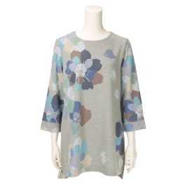 アシンメトリーな切り替えがアクセントになったプルオーバーです。襟のデザインと身頃、袖部分に大胆にほどこされたフラワー柄もデザインのポイントになっています。