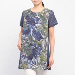 アシンメトリーな切り替えがアクセントになったプルオーバーです。襟のデザインと身頃、袖部分に大胆にほどこされたフラワー柄もデザインのポイントになっています。