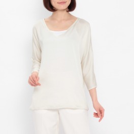 ■身頃: ベース生地には素材感に富み、肌当たり面積も少ないネップ感のあるスラブ糸を使用。袖は、七分袖のベルスリーブを採用しました。