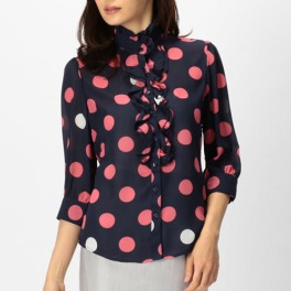 ナラカミーチェシフォン配色ドットプリントフリルアクセント七分袖ブラウス