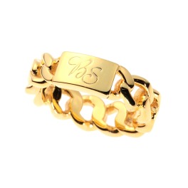 チェーンをデザインしたアームに、筆記体で“BonSens”の“B”と“S”の文字を入れたスクエアプレートをあしらったリングです。