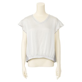フリルデザインの袖が目を惹くプルオーバーです。程良く光沢感のある生地と伸縮性のあるカットソー素材を組み合わせているので、快適な着心地です。