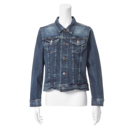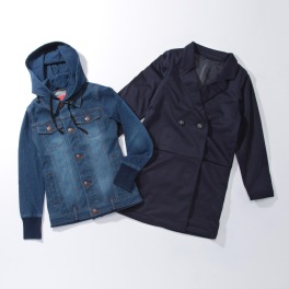 ■身頃:柔らかく、ストレッチ性のあるデニムを使用。襟はやや小さめに仕立てることでネックラインを美しく見せ、女性らしい印象を演出。