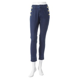 ■身頃:脚がきれいに見えるようにこだわった、程良い広がりのセミワイド風のシルエットに設定。フロントのウエストボタンには当ブランドの刻印をほどこしています。
