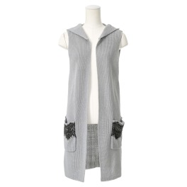 ■身頃:膨らみのある素材を7ゲージで凹凸感の美しい片畦編みに編み上げました。ポケットには繊細なレースをほどこし女性らしさを演出し、カジュアルすぎない上品なデザインに仕上げています。