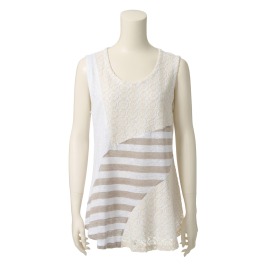 ■身頃: 緩やかなAラインのウエストシルエットにデザイン。前身頃は、綿混のレースとボーダー柄と無地のリネン100%のジャージー素材を組み合わせた、切り替えデザインに仕上げました。