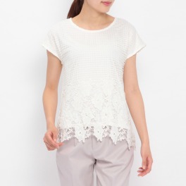 ●SHOP先行販売(先行販売)■身頃: 伸縮性のあるカットソー素材に、繊細な柄を組み合わせた立体感のあるレースを重ねました。