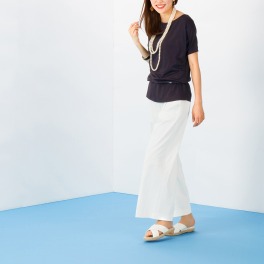 ■身頃: カジュアルすぎずフェミニンすぎない、程良い幅に設定したラウンドネックで、さりげなく腕周りをカバーする袖丈に設定。