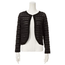 ■身頃: ラメ糸を編み込んだ生地を使用。動きに合わせて上品な輝きを表現し、華やかさを演出。伸縮性があり、楽に着脱できる点も魅力です。