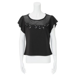 胸元のほどよい透け感と、キラキラ光るビーズ刺しゅうがフェミニンな雰囲気の半袖プルオーバーです。手作業によってほどこしたビーズ刺しゅうがアクセント。