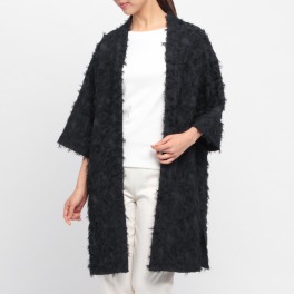 襟から前立て部分に、チェック柄のサッカー生地を合わせたフリルが華やかなニットカーディガンです。フリルの縁部分にはラメ糸でアクセントをほどこしており、ボリューム感のある襟のラインが、華やかでノーブルな…
