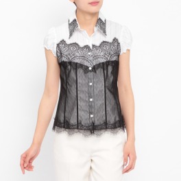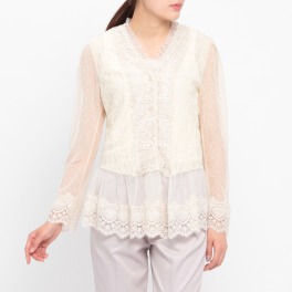 ■身頃: ロマンチックな柄のレースなど、数種類のレースを切り替えたデザイン。袖や後ろ身頃ヨーク下などには、ネットやチュールを用いて、柔らかで繊細な雰囲気をプラス。