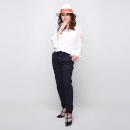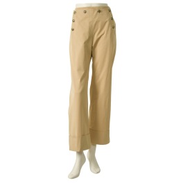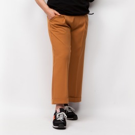 ■身頃:ウエスト部分にタックを配し、腰周りをカバーする細身の美しいシルエットに設定。後ろウエストはゴム仕様に仕上げ、はきやすさを考慮しました。