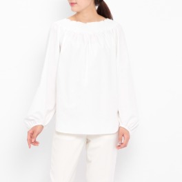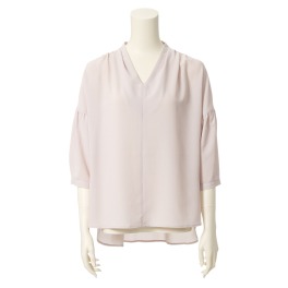 ■身頃: フロントをVネックに設定することで、全体の印象を引き締めます。襟脇の肩線部分と袖付け部分、後ろヨーク下部分それぞれにギャザーをほどこし、膨らみとボリュームを表現。