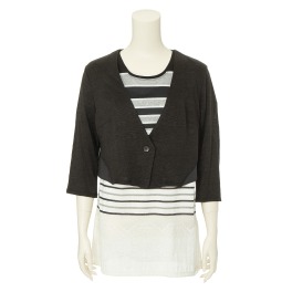 身生地に麻を使用したボレロと、レース調の先染めボーダー柄をデザインした半袖インナーのアンサンブルです。