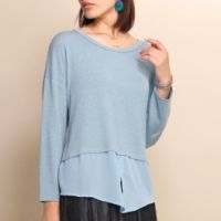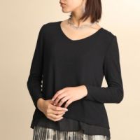 ■身頃: シンプルなVネックに設定。 身頃内側にジョーゼット素材を配したレイヤードデザインです。裾部分から見えるジョーゼット素材が、デザインのアクセントに。
