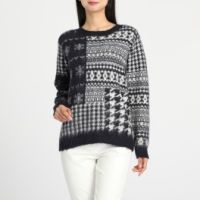 ■身頃: 伝統的なフェアアイル柄や雪、大小の千鳥格子柄を組み合わせ、パッチワーク風に編み上げました。