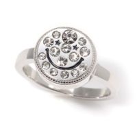 目と口をブラックがかったネイビーカラーのエナメルで描き、ビジュウをあしらったスマイルモティーフのリングです。