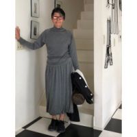 ■身頃: ベース部分に用いた裏毛素材にウォッシュ加工をほどこし、ヴィンテージ感をプラスしました。 ウエストはラメ入りの異素材で切り替え、デザインのアクセントに。