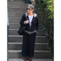 ■身頃: ベース部分に用いた裏毛素材にウォッシュ加工をほどこし、ヴィンテージ感をプラスしました。 フード内側と袖口、裾をラメ入りの異素材で切り替え、デザインのアクセントに。